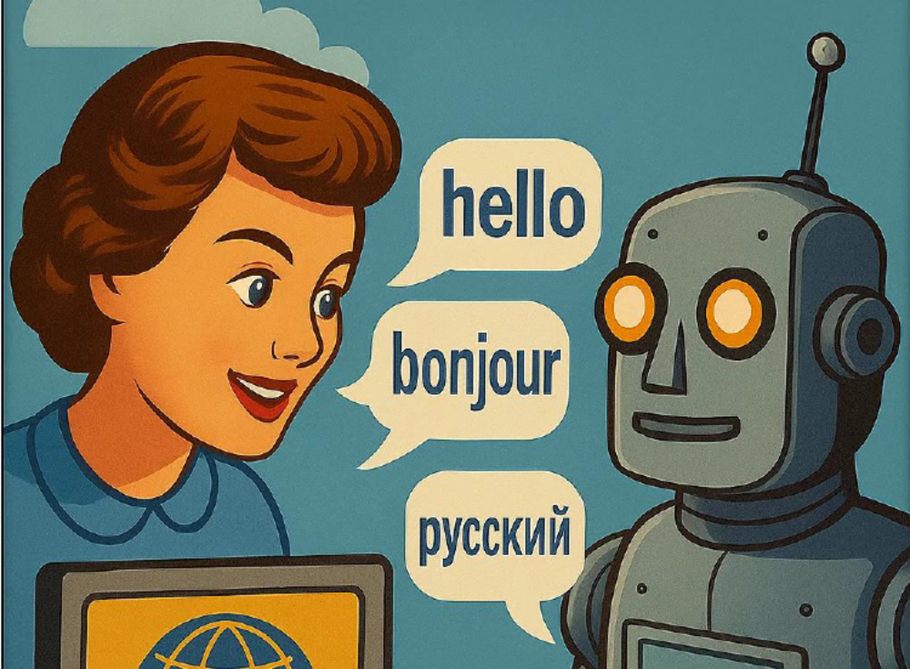 Retro-style Bild von einem Roboter, einem PC und einer Frau, die sich mehrsprachig unterhalten (Sprechblasen)